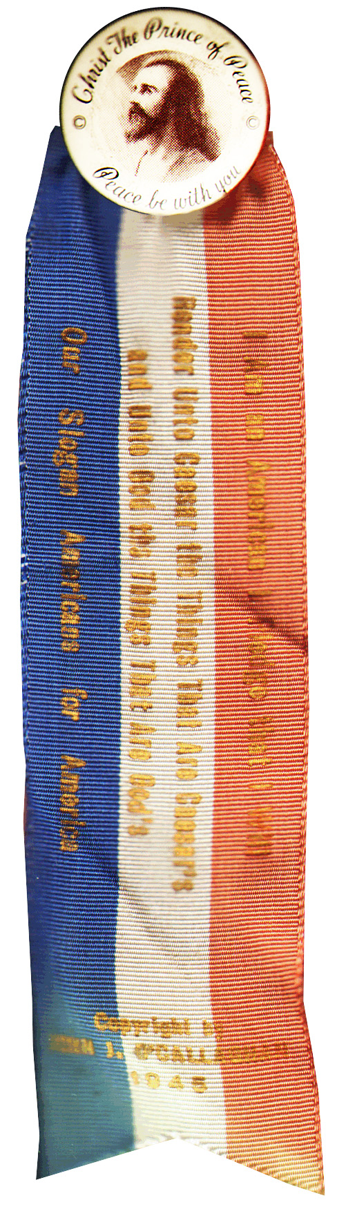 NonPol20-31 "Christ the Prince of Peace --Peace Be With You" with 1945 copyright 1" celluloid button with 4" ribbon